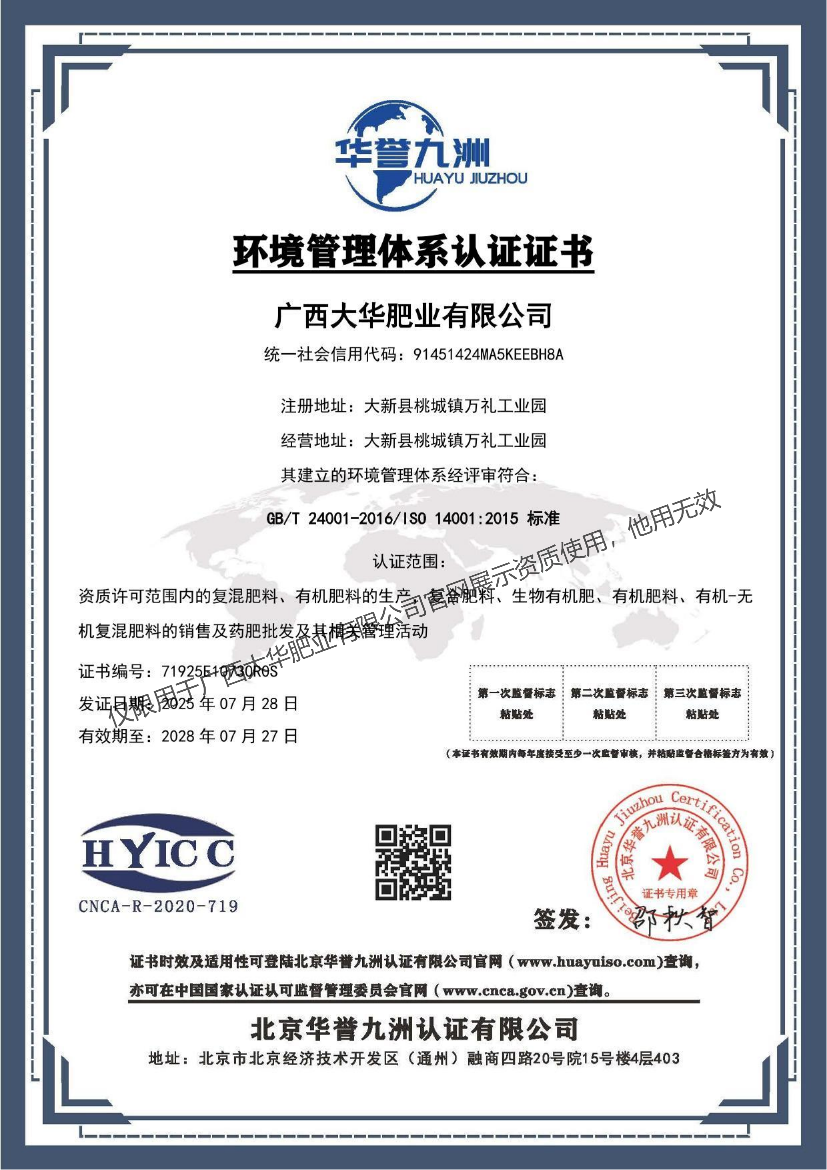 环境管理体系认证证书