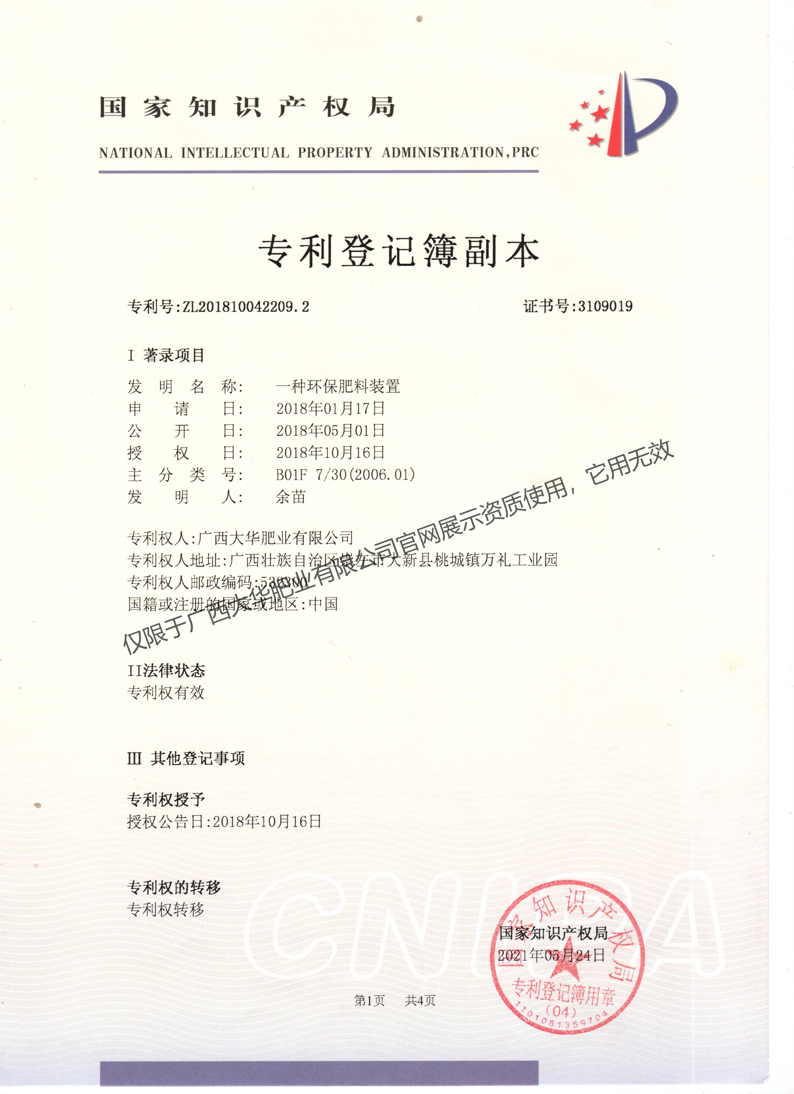 ④一种环保肥料装置-专利号ZL201810042209.2发明专利