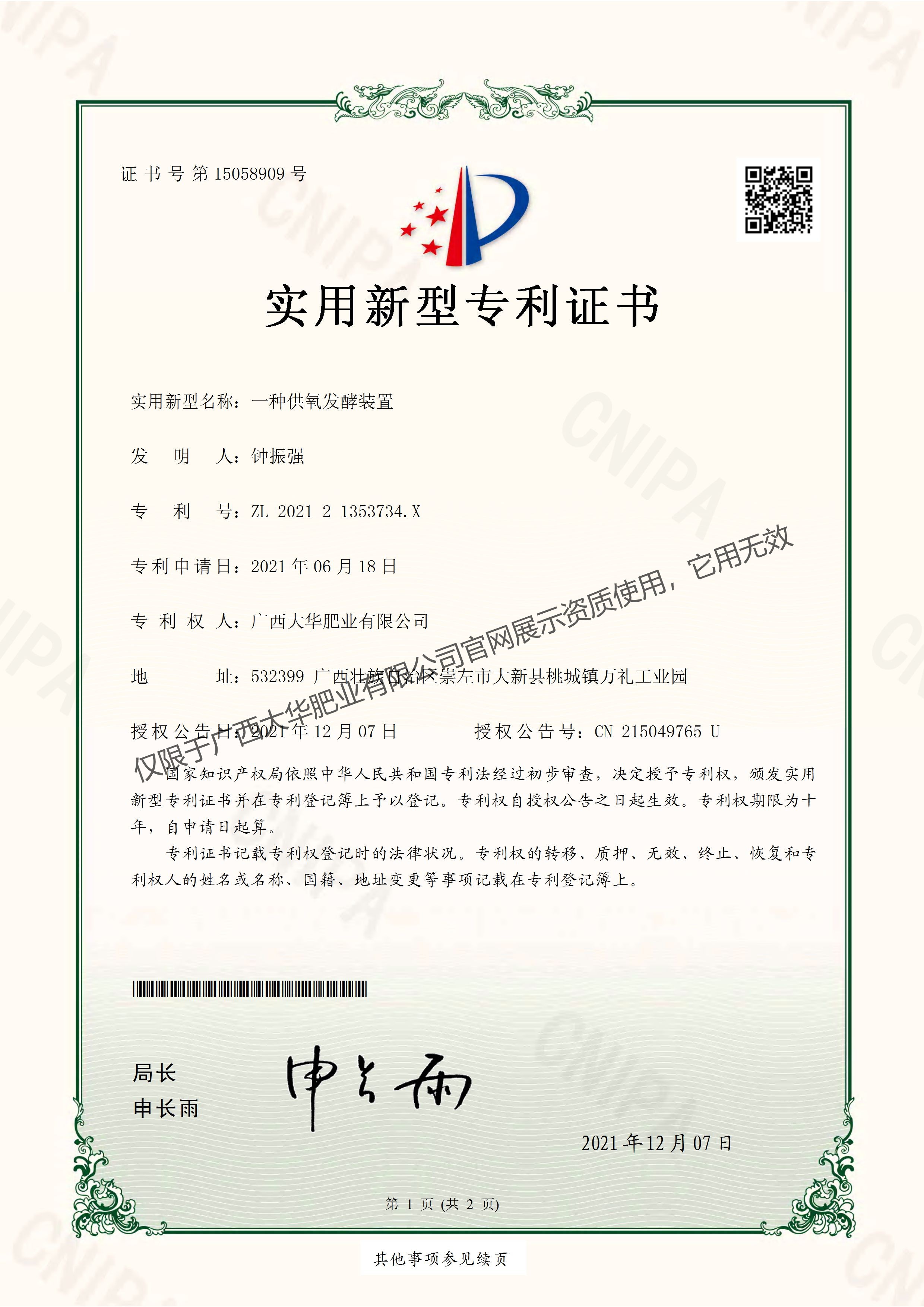 ③实用专利证书-一种供氧发酵装置202121353734X-实用新型专利证书-页面1